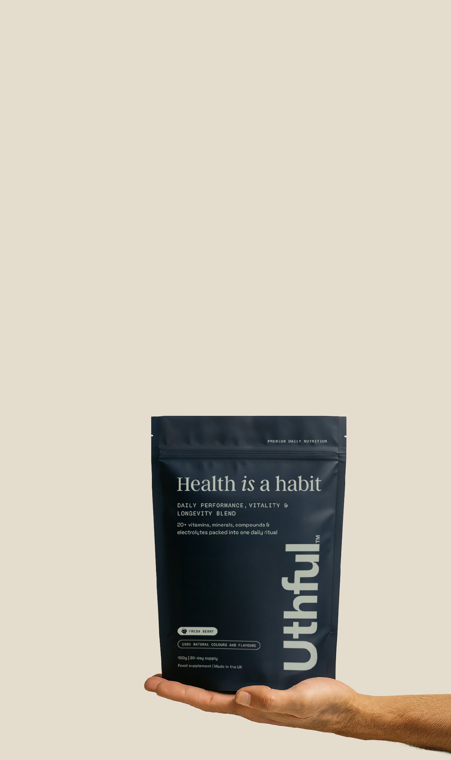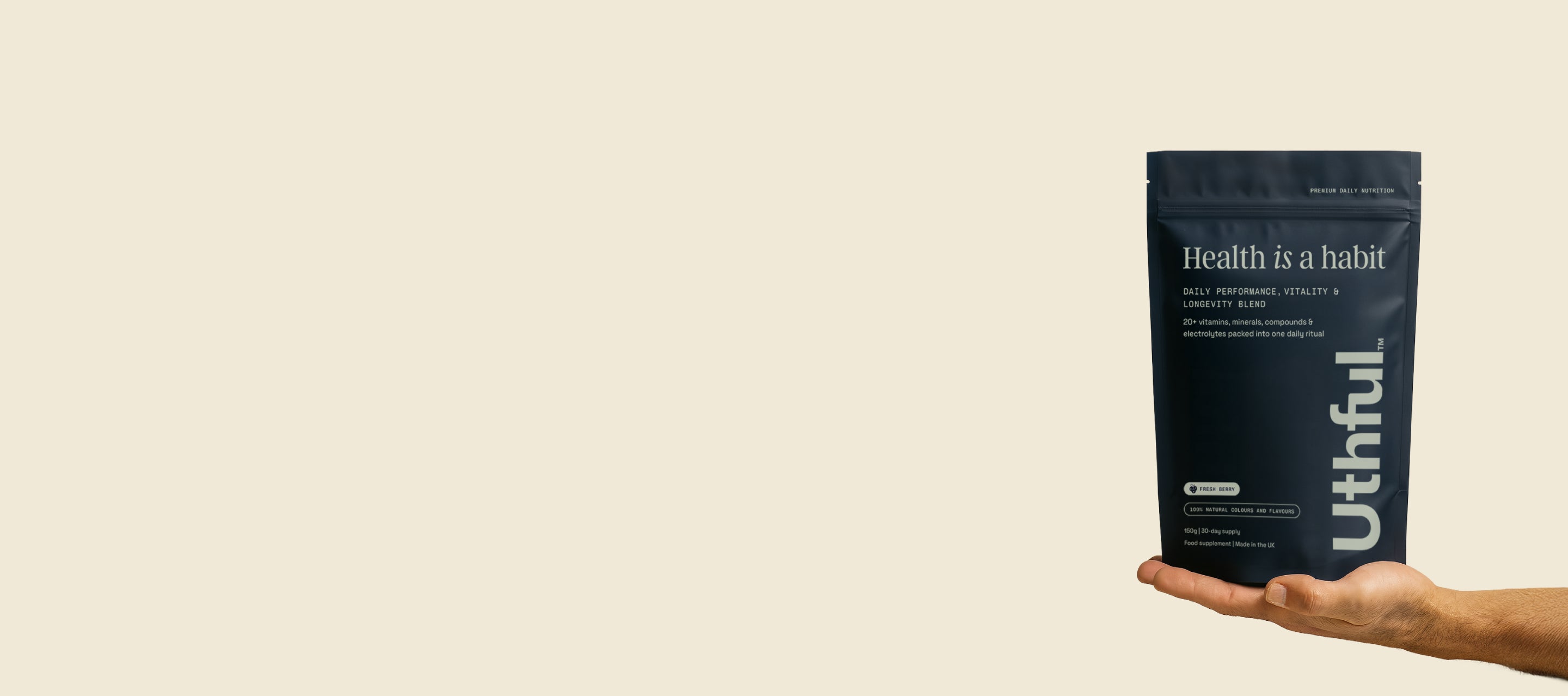 In some ways health and longevity have become a circus, with millionaire tech founders trying to outlive each other, 80-ingredient green powders, wildly expensive treatments, complex supplement stacks and extreme protocols no normal person can follow. An obsession for optimisation has made health and wellness feel out of reach for many of the people who want/need it most: busy professionals and stressed-out parents trying to balance work, family, ambition and health. Uthful was created, in part, as the antidote. We reject “bio hack” culture in favour of something more grounded: good daily habits and consistency. Uthful is a simple, evidence-led, all-in-one daily blend designed for active, health-conscious people that are also stretched, stressed, and overworked. It’s for those balancing careers, kids, commutes, ageing parents, relationships… and somewhere in the middle of all that, they still find some time to go the gym, do a class, jump on the bike and make a nutritional meal at the end of the day. It’s for the ones who strive to live fully, not perfectly. To help you feel sharper, stronger and energised, not immortal. There are no miracle promises, gimmicks, hacks, or shortcuts. Just consistency that compounds.
